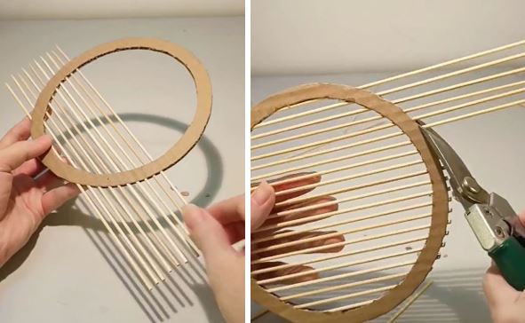 - Mỗi vòng tròn xuyên que tre/ gỗ như hình sau.