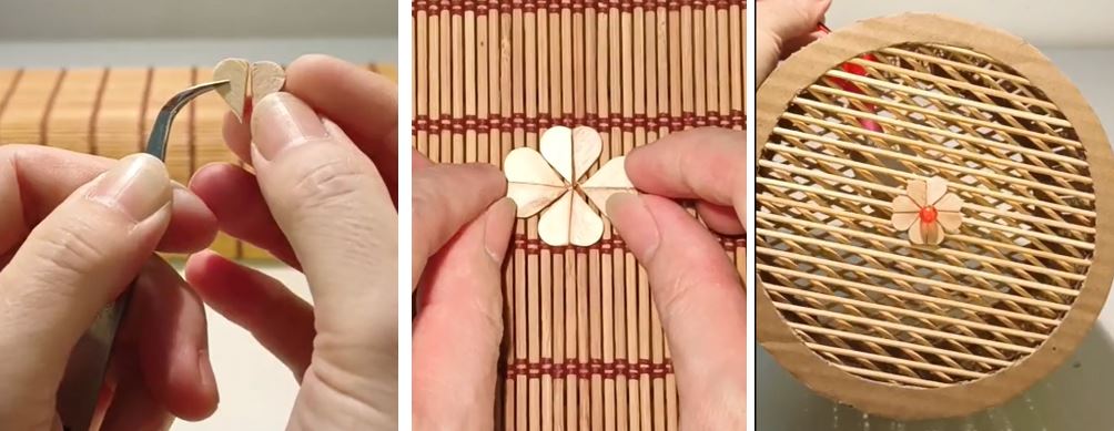 - Dán keo 2 mặt vào mặt đáy, và lần lượt dán các nan vào hết vòng tròn xung quanh mặt đáy.