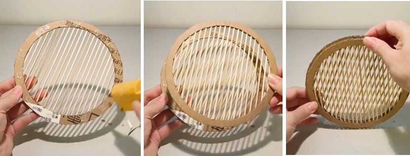 - Dán keo 2 mặt vào mặt đáy, và lần lượt dán các nan vào hết vòng tròn xung quanh mặt đáy.