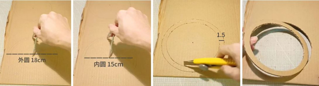- Dùng compa và dao rọc giấy tạo tất cả 4 vòng tròn bằng nhau trên bìa giấy carton với kích thước tham khảo như hình hoặc tùy chỉnh theo mong muốn.